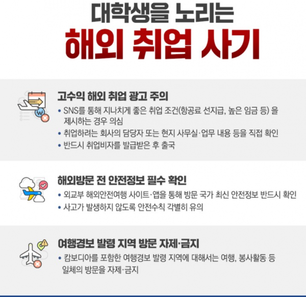 1. 최근 발생한 캄보디아 한국 대학생 납치·사망 사건 등 해외 취업 시도 과정에서 우리 국민의 안전이 위협받는 사건이 증가하고 있습니다.