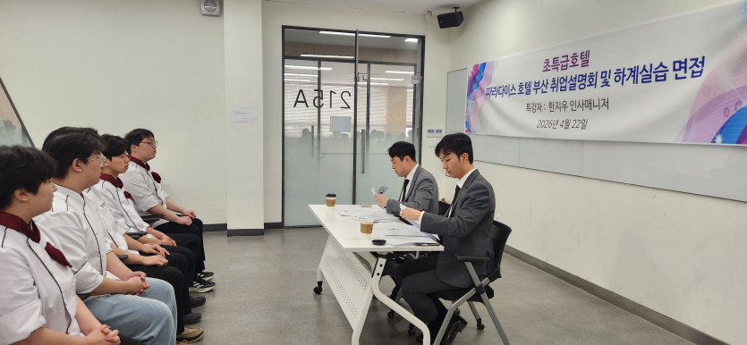 2026.04.22-파라다이스호텔 취업설명회 및 하계현장실습 면접진행 페이지 정보 작성일2026-04-23 16:46 관련링크 본문 파라다이스 호텔 취업설명회 및 하계실습 면접이 진행되었습니다. 목록 다음글2026.04.20- 해오름농장 견학 2026.04.23